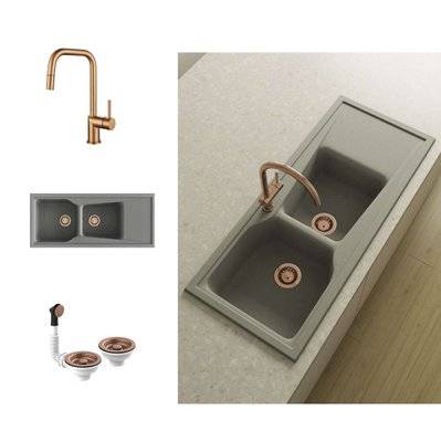 QUADRON Evier double gris, EVAN 121 GraniteQ, Evier de cuisine, 2 bacs en granit en 1160 x 500 x 210 mm, Evier ouvert Push 2 avec siphon avec égouttoir, éléments en cuivre PVD