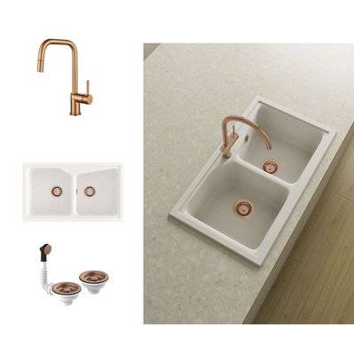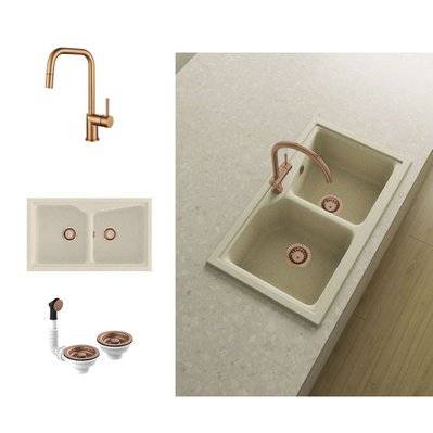 Poalgi Pack Evier 2 bacs POALGI City Snow + mitigeur avec douchette bonde or rosé