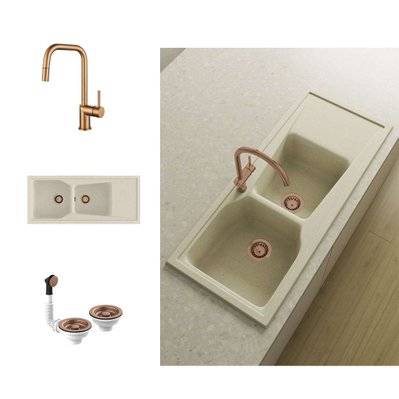 Poalgi Pack Evier 2 bacs POALGI City Pumice + mitigeur avec douchette bonde or rosé