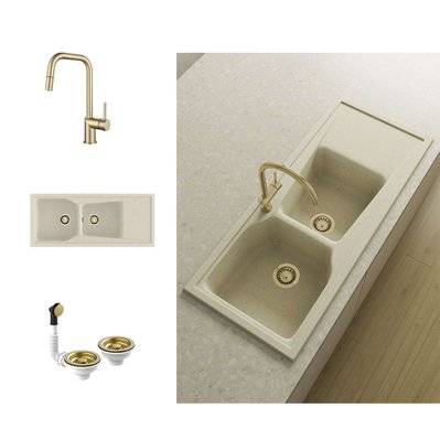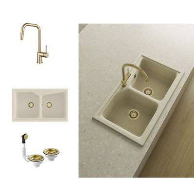 Poalgi Pack Evier 2 bacs POALGI City Pumice + mitigeur avec douchette bonde or