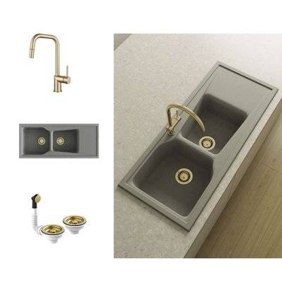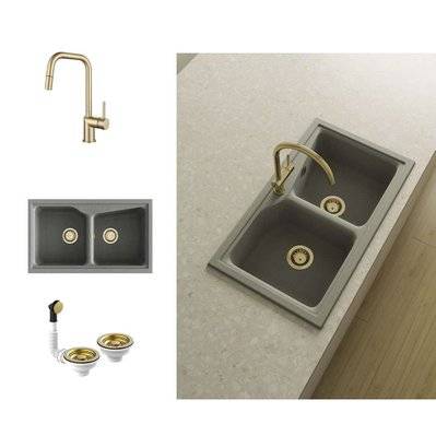 Poalgi Pack Evier 2 bacs POALGI City Ash + mitigeur avec douchette bonde or
