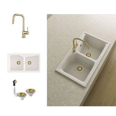 Poalgi Pack Evier 2 bacs POALGI City Snow + mitigeur avec douchette bonde or