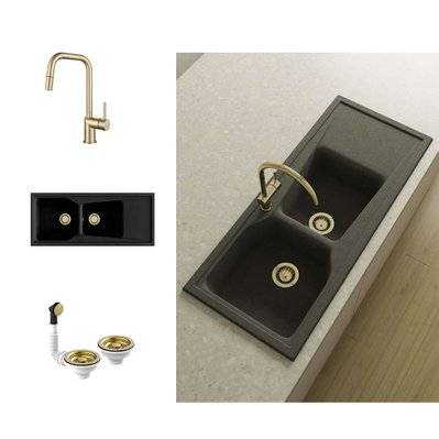 Poalgi Pack Evier 2 bacs POALGI City Basalt + mitigeur avec douchette bonde or