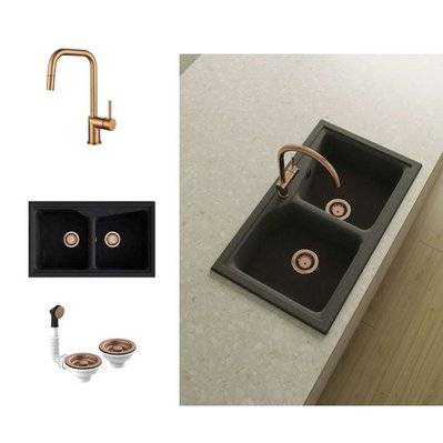 Poalgi Pack Evier 2 bacs POALGI City Basalt + mitigeur avec douchette bonde or rosé