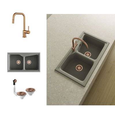 Poalgi Pack Evier 2 bacs POALGI City Ash + mitigeur avec douchette bonde or rosé