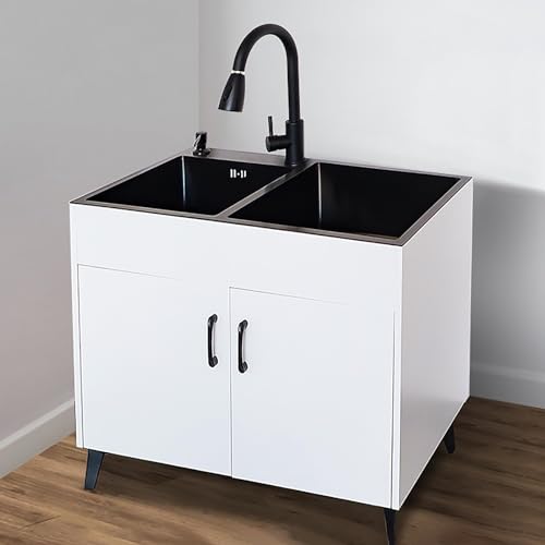 WIQUYBML Évier Utilitaire sur Pied avec Meuble intégré pour Usage Commercial, idéal pour Restaurant, Garage, buanderie - Robinet d'eau Chaude et Froide Inclus, Finition Noire élégante