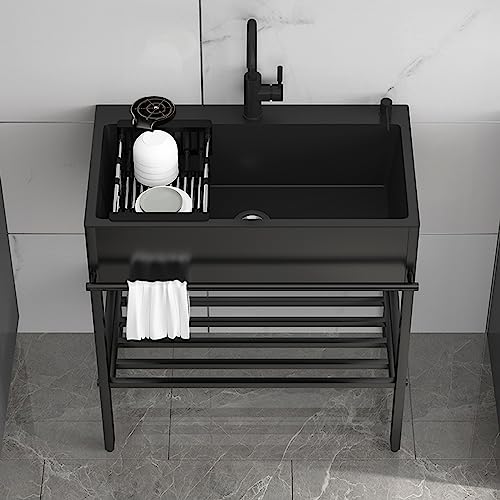 Evier Buanderie Utilitaire,Extérieur Évier De Jardin,Évieren Céramique,Support Inox,Autoportant Évier de cuisine Cuve simple,avec eau chaude et froide Robinet,Filtre de Vidange,Couleur Blanche ( Color