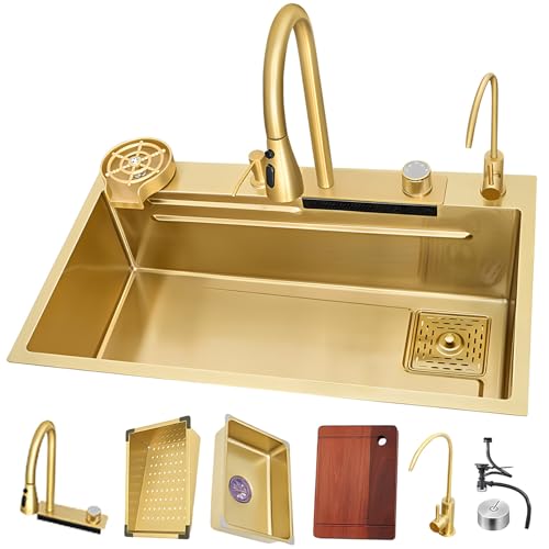 Évier De Cuisine Cascade Doré, avec Robinet Extractible, Panier De Vidange, Lave-gobelet, Kits De Vidange, Évier De Cuisine en Acier Inoxydable, Évier Simple Multifonction(80x45x22cm)