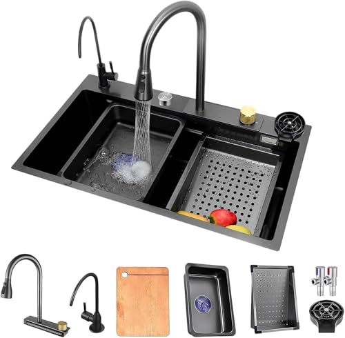 AIVANOTO Évier De Cuisine Cascade Noir, avec Robinet Multifonction, Lave-gobelet, Bouton De Vidange, Robinet À Boire, Ensemble De Vidange, Grand Évier De Poste De Travail(Noir,75x46x22cm)