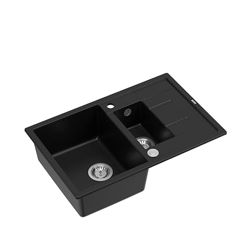 QUADRON Evier en granit | Taille 78 x 50 x 22 cm Couleur: Noir + Doré Pvd | MORGAN 116 Granit Evier de cuisine 1,5 bac avec égouttoir | Evier encastré avec trou pour robinet