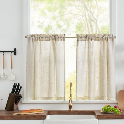 TOPICK Rideau Cuisine Court Petit Rideaux Brise Bise, Beige 90L x 90H(cm) 2 Panneaux à Passe Tringle, Mélange de Lin avec Dentelle, pour sous Evier Fenêtre Placard Meuble Bas Chambre Cache