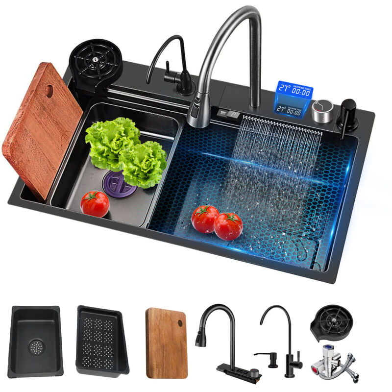 Évier de cuisine à cascade en acier inoxydable 304 Evier de cuisine noir Affichage numérique Grand évier simple Évier avec Robinet