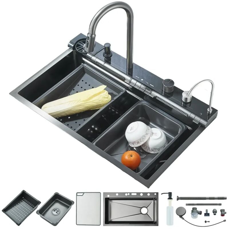 Évier de Cuisine Cascade Evier multifonction de Cuisine en Acier Inoxydable Noir Gris Affichage numérique Grand évier 75x46CM