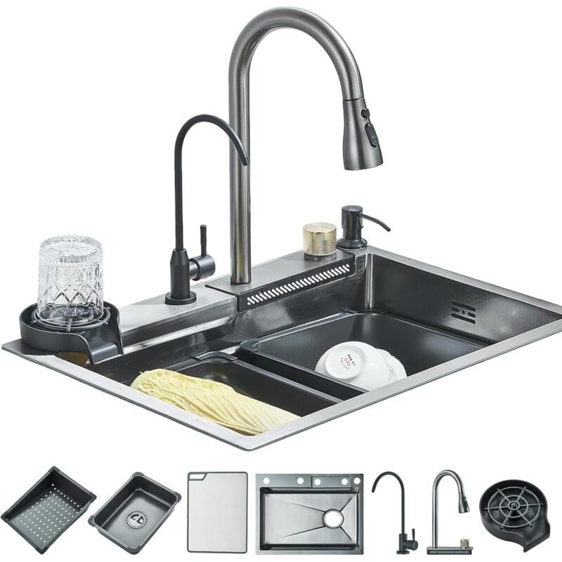 WDSOPK Évier De Cuisine Cascade en Acier Inoxydable Gris Noir avec Robinet À Douchette Extractible Et Accessoires