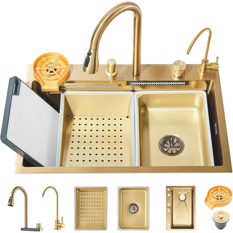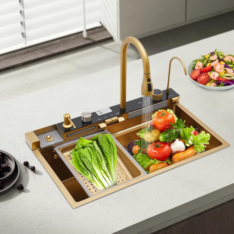 Évier de Cuisine Cascade Multifonction doré brossé acier inoxydable 75 * 45CM Evier de cuisine Affichage numérique Grand évier