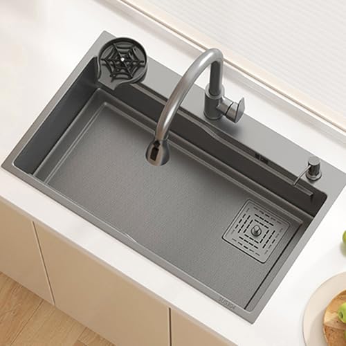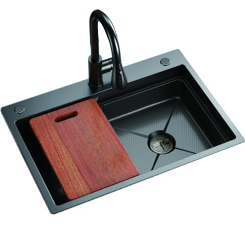 ZQFHSX Évier de Cuisine Multifonction en Acier Inoxydable 304, Style Cascade, à Une cuve, Nano RV, avec Robinet extractible, Montage sur Plan ou sous Plan (Couleur : Noir-b, Dimensions 75