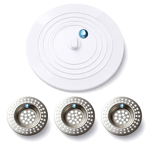 Bouchon Universel pour Baignoire - JaMoonLBV JmL® Marque Française - Bouchon Ventouse en Silicone Ø 15 cm + 3 Filtres évier en Acier INOX Ø 7 cm - Cuisine, Salle de Bain, Lavabo