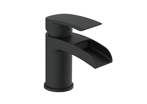 VeeBath Stream Robinet mitigeur de lavabo rond cascade mono, finition noire mate, levier unique, robinet d'évier moderne avec bonde de vidage, robinet de salle de bain monté sur le plateau, design