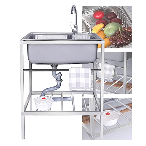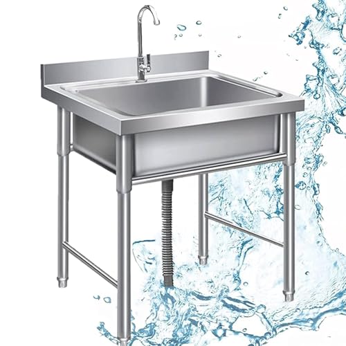 Evier utilitaire acier inox pour l'extérieur, bassin plonge cuisine sur pied avec robinet, station lavage main commerciale seul bol avec kit d'évier égouttoir, pour buanderie/le jardin/garage (Size