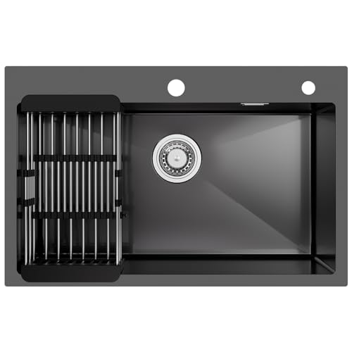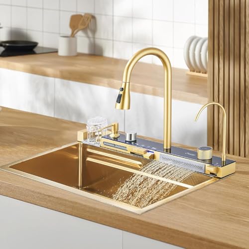 JUNSOTTOR Évier de Cuisine Cascade Multifonctionnel,Éviers de Cuisine en Acier Inoxydable,Evier de Cuisine Nano Raindance Noir 1 Bac avec Robinetterie Extractible Rinceuse en Verre(60x45cm)