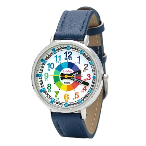 Kiddus Montre Bracelet Éducative pour Enfants, Fille, garçon. Time Teacher Analogique avec Exercices. Facile d’Apprendre à Lire l’Heure. Conçu à Barcelona. Dutch PU Leder Blauw