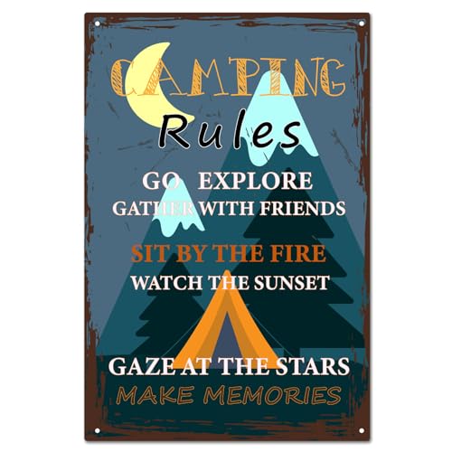 shgwehh Panneau de règles de camping vintage en métal - Décoration murale rétro - Plaque en fer à suspendre pour camping - 30,5 x 20,3 cm - Go Explore Gather With Friends