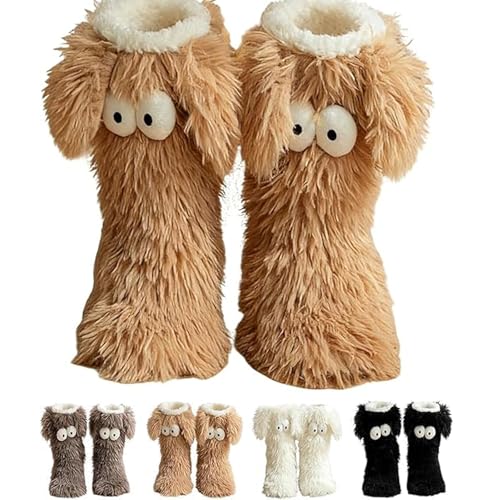 Muffle Friends Cozy Socks with Eyes for Women,funny Slippers for Women,Cute Big Eyes Women’s Funny Fuzzy Slipper Socks with Ears,Non-Slip House Warm Sock, Winter Warm Fluffy Soft Slippers (khaki)