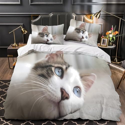 XQGASOEBN Cute Kitten Eyes Housse de Couette 3D Effet Microfibre 3 Pièces Éclair Ultra Douce Soft Tabby Parure de Lit Super Douce Entretien Facile for Adolescent Single(135x200cm)