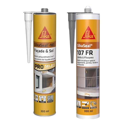 Sika - SikaSeal-183 Façade & Sol, Ton pierre, Mastic Polyurethanne souple pour joints de façade & eal 107 Joint et Fissures Gris, Mastic acrylique professionnel multi support pour joints