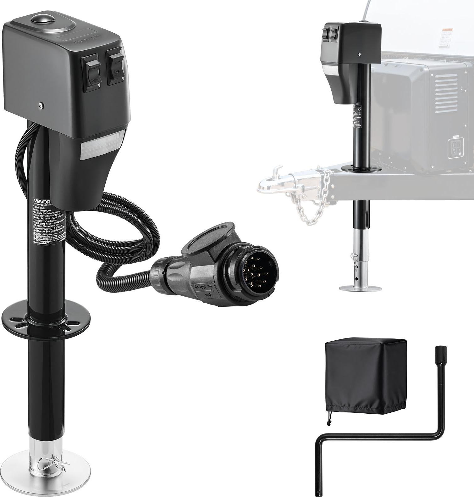 VEVOR Cric électrique pour remorque 2268 kg, béquille électrique 230-686 mm de course, support pour remorque de camping-car avec manivelle, housse de protection et LED pour caravanes, camping-cars et camping-cars, 12 V CC avec faisceau de câbles