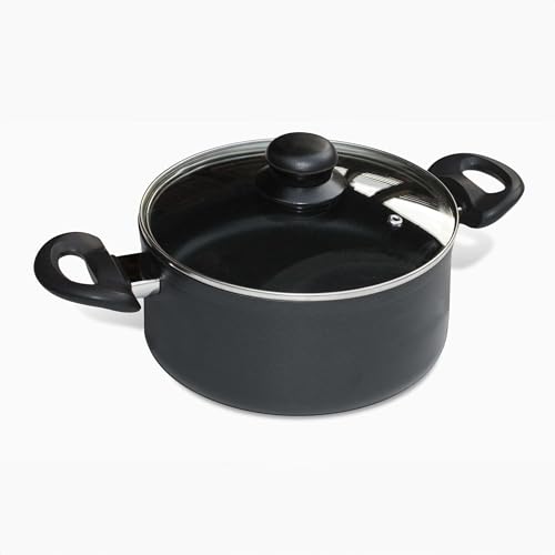 Baumalu, Faitout 20 cm EASY en aluminium forgé avec couvercle en verre, intérieur revêtement anti-adhérent, extérieur noir, manche bakélite avec cache inox, compatible tous feux et induction