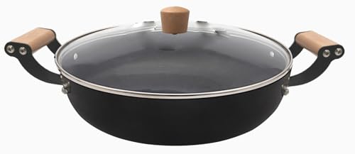 BAUMALU - Faitout - Fonte d'Acier Émaillée - Tous Feux dont Induction - Résistant Rouille et Rayures - Couvercle en Verre avec Bords Inox et Trou Vapeur - Poignées Hêtre Vernis - Ø30cm - Noir/Bois