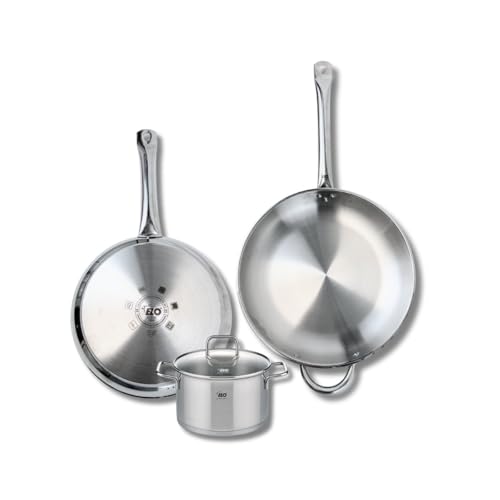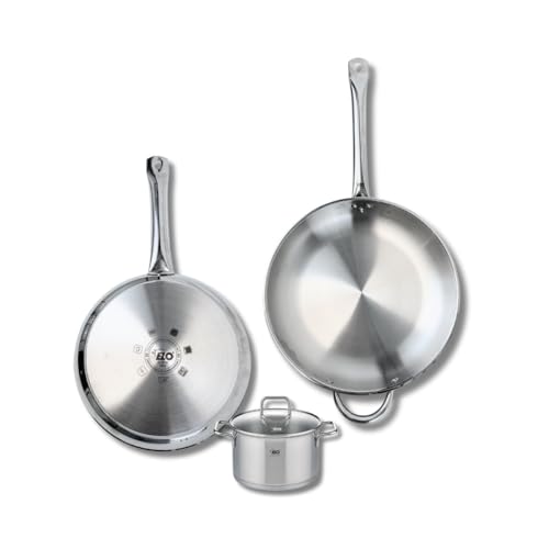 ELO 9727950 Batterie de cuisine 3 pièces, Ensemble de 2 Poêles de cuisson 20 et 32 cm et 1 faitout 12 cm Elo Prima Brillant, inox, induction
