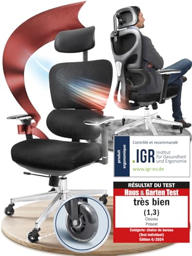 CLOUVOU Chaise Bureau Ergonomique ProSeat [Élue N°1] Fauteuil de Bureau & Chaise Gaming | Charge maximale 150kg (Noir)