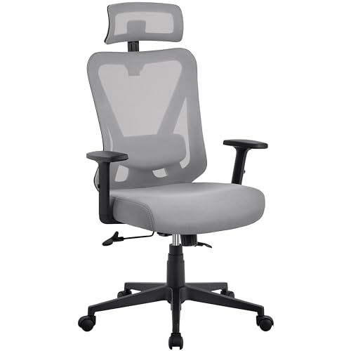 Yaheetech Chaise Bureau Ergonomique Respirante Fauteuil de Bureau en Maille Support Lombaire et Siège Inclinaible Appui-tête Accoudoirs Réglables roulettes pivotantes Charge 136 kg Gris Clair