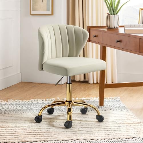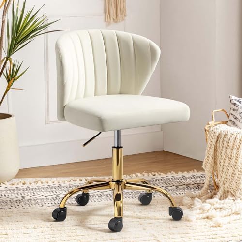 HULALA HOME Chaise de Bureau sans Bras en Velours, Fauteuil de Bureau Mignonne en Velours Moderne, Siège Roulante Pivotante à Dossier Bas Réglable,Chaise Bureau Fille,Blanc