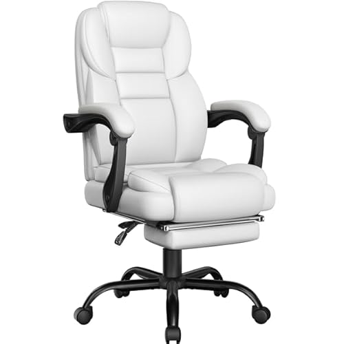 Efomao Fauteuil de Direction, Chaise de Bureau en Cuir PU, Fauteuil de Bureau Ergonomique Ajustable à Dossier Haut, Pivotant 200kg avec Repose Pieds et Support Lombaire, Blanche
