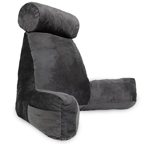 Ella Coussin de Lecture avec Rouleau de Cou - Oreiller de Lecture avec Accoudoirs, Soutien du Dos et du Cou pour la Lecture ou la Relaxation - Coussin de Dossier Fauteuil de Lecture - Velours (Gris)