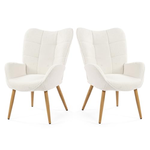 MEUBLE COSY Lot de 2 Fauteuil de Salon Chambre Scandinave Chaise Coiffeuse avec Accoudoirs et Assise Épais Pied Bois Massif Rembourré en Boulette Beige