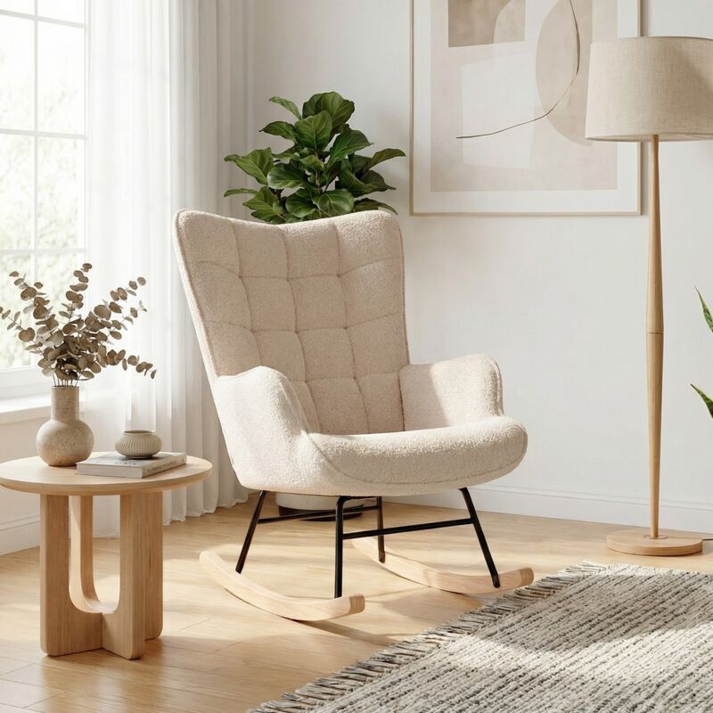 Rocking chair,Fauteuil à bascule en peluche confortable,dossier haut, accoudoirs rembourrés, mousse haute densité, pieds en hêtre naturel - Beige