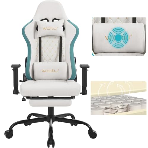 WOLTU Chaise Gaming, Chaise Bureau Massante, Fauteuil Ergonomique avec Coussin Lombaire Massant, Siège Large à Ressorts, Appui-tête, Repose-Pieds, Tissu Technique, Charge 150kg, Blanc