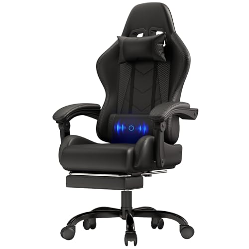 Yaheetech Chaise Gaming Massante Ergonomique Fauteuil Gamer Dossier et Appui-tête Hauteur Réglable avec Repose-Pied Similicuir Charge 136kg Noir
