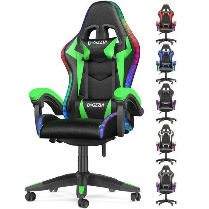 Chaise Gaming - BIGZZIA Fauteuil gamer ergonomique - éclairage LED Effets - 155°Dossier inclinable - jusquà 136Kg - Noir et Verte