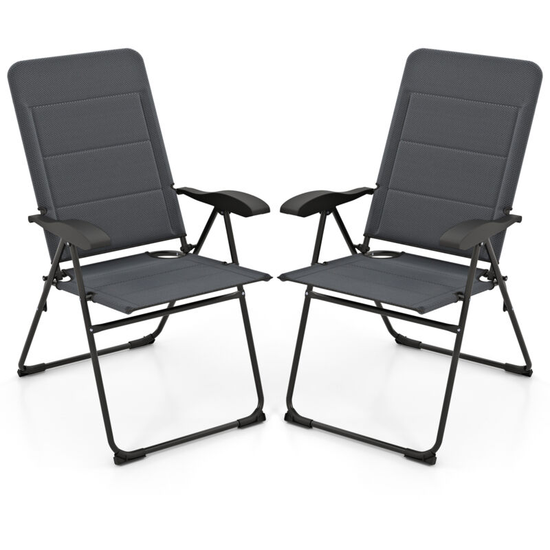 Costway - Lot de 2 Chaise Pliante Exterieur, Fauteuil de Jardin Exterieur avec Accoudoirs, Dossier Haut Réglable à 7 Positions, Gris