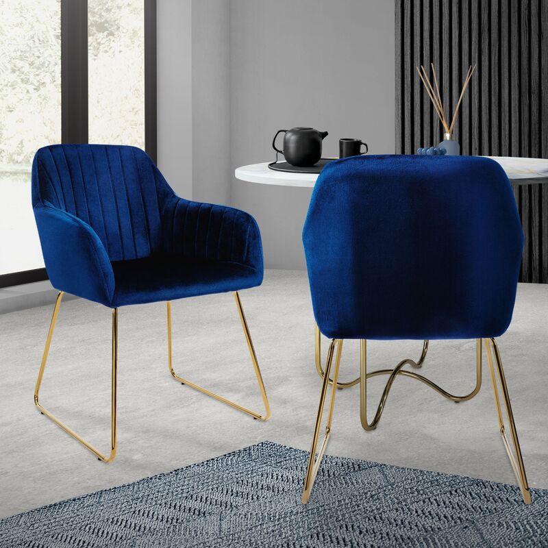 Set de 2 Chaises de Salle à Manger, Bleu, Assise Rembourrée en Velours, Pieds Dorés en Métal, avec Dossier et Accoudoirs Ergonomiques, Fauteuil