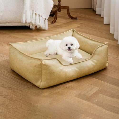 WPJBDS Canapé-Lit pour Animaux De Compagnie en Cuir Souple, Fauteuil-Lit pour Chiens De Petite Et Moyenne Taille, Meubles pour Chiots Et Chats avec Revêtement en Cuir PU Et Coussin Amovible,Beige,S