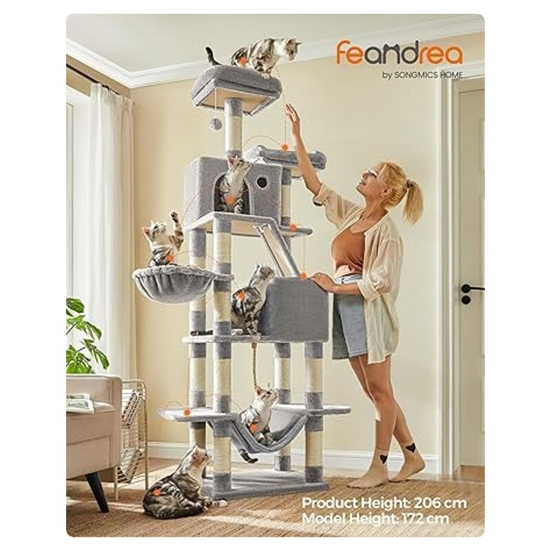 Feandrea grand arbre à chat, hauteur 206 cm, arbre à chat XXL, avec 13 griffoirs, 2 plates-formes, 2 grottes, panier, hamac, balles en peluche