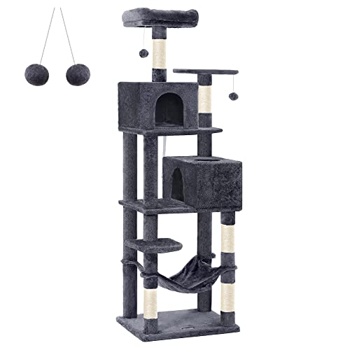Feandrea Arbre à Chat 191 cm de Hauteur, Tour de Jeux, avec 5 Poteaux à Griffer, 2 Plateformes, 2 Niches, Un Hamac, 2 Pompons, Tissu Peluche, Multi-Niveaux, Gris Foncé PCT191G01