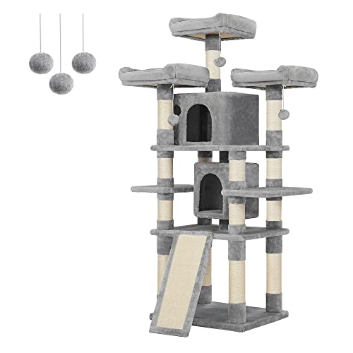 Feandrea PCT153W01 Arbre à chat XXL - 196 cm - avec 2 plateformes, 3 niches, 2 couchettes, 5 poteaux à griffer, 4 balles en peluche, tunnel et brosse, gris clair
