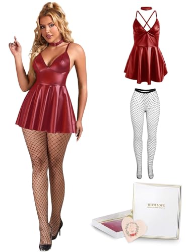 ohyeahlady Robe Cuir Sexy Femme Erotique Club Libertin Grande Taille Collant Resille Mini Robe Moulante Courte Decollecte Soiree Tenu Curvy Ensemble Lingerie Deguisement Cosplay Rouge+Collant,M